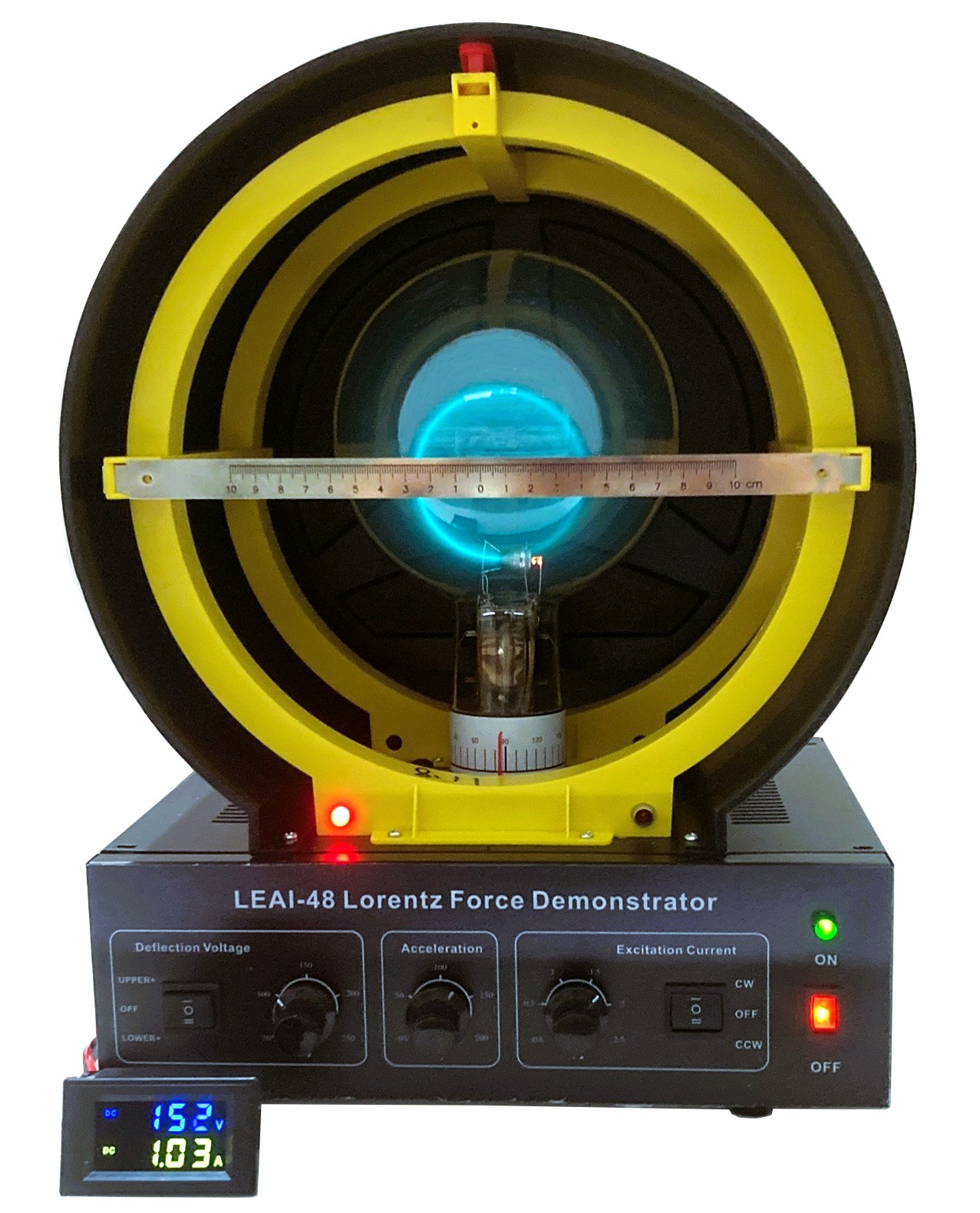 This Lorentz Force e/m Apparatus is designed to measure the charge-to-mass ratio (e/m) of the electron. It also serves to demonstrate the Lorentz force exerted by a magnetic field on moving electrons, as well as the deflection of electrons under an electric field.